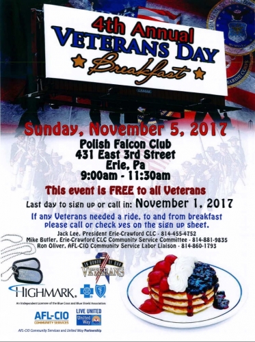 The 4th Annual Veterans Day Breakfast at the Polish Falcon Club will occur on Sunday, November 5 from 9-11:30 am. The event is free to all veterans.