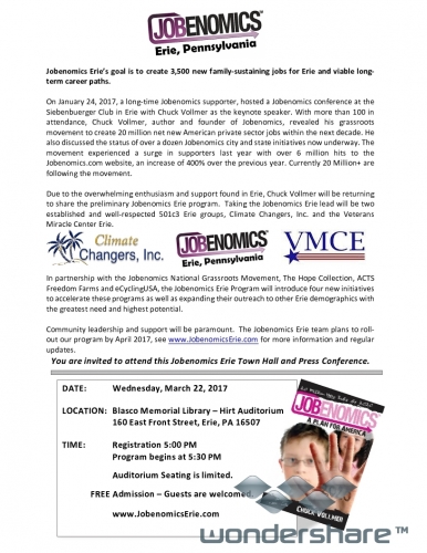 On March 22, Chuck Vollmer, author and founder of Jobenomics, will be returning to share the preliminary Jobenomics Erie program. Taking the lead will be two established and well-respected 501c3 Erie groups, Climate Changers, Inc. and the Veterans Miracle Center Erie. The Jobenomics Erie team plans to roll-out the program by April 2017. The Jobenomics Erie Town Hall and Press Release will be held at the Blasco Library Hirt Auditorium (160 East Front St., Erie, PA). Registration begins at 5pm, and the program begins at 5:30pm. Admission is free, but seating is limited. For more information, visit www.JobenomicsErie.com. |