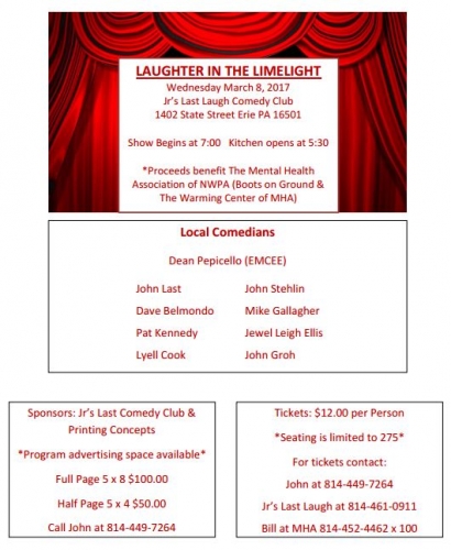 On March 8th, The Mental Health Association is holding a fundraiser at Jr's Last Laugh Comedy Club (1402 State St, Erie) to benefit Boots on Ground and the Warming Center of MHA. The show begins at 7:00pm, and the kitchen opens at 5:30pm. Local comedians include Dean Pepicello (EMCEE), John Last, John Stehlin, Dave Belmondo, Mike Gallagher, Pat Kennedy, Jewel Leigh Ellis, Lyell Cook, and John Groh. Tickets are $12.00 each. For tickets, contact John at (814) 449-7264, Jr's Last Laugh at (814) 461-0911, or Bill at MHA (814) 452-4462 x 100. Program advertising space is also available. If interested, please contact John at (814) 449-7264. |