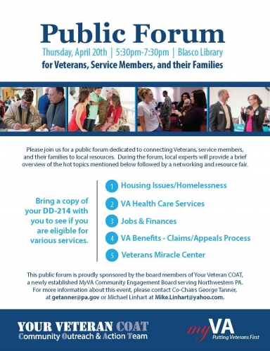 Your Veteran Community Outreach & Action Team will be hosting the first of three public forums at the Blasco Library in Erie from 5:30 to 7:30 on April 20th. All veterans are welcome to come discuss their concerns. The forum is dedicated to connecting veterans, service members, and their families to local resources, and the forum will be followed by a networking and resource fair. Bring a copy of your DD-214 to see if you are eligible for various services. Experts will provide a brief overview of the topics: Housing Issues/Homelessness, VA Health Care Services, Jobs & Finances, VA Benefits - Claims/Appeals Process, and Veterans Miracle Center. For more information, contact Co-Chairs George Tanner at getanner@pa.gov or Michael Linhart at Mike.Linhart@yahoo.com. |