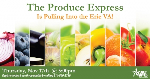 The Produce Express is coming to the Erie VA on Thursday, November 17 at 5pm. The Produce Express is a mobile Food Pantry that makes fresh, healthy produce and grocery items available for FREE to those who qualify. Advanced registration is required so call 814-860-2780 to see if you qualify and register.