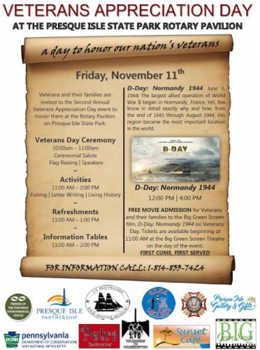 On Friday, November 11, veterans and their families are invited to the Second Annual Veterans Appreciation Day, which will take place at the Presque Isle State Park Rotary Pavilion. It is a free event to honor our veterans and their families. The Big Green Screen film D-Day: Normandy 1944 tickets will be available for free beginning at 11am on a first come, first served basis at the Big Green Screen Theater. Show times are at 12:00pm and 4:00pm. The Big Green Screen Theater is located in the Tom Ridge Environmental Center. For more information about the event, call 814-833-7424.